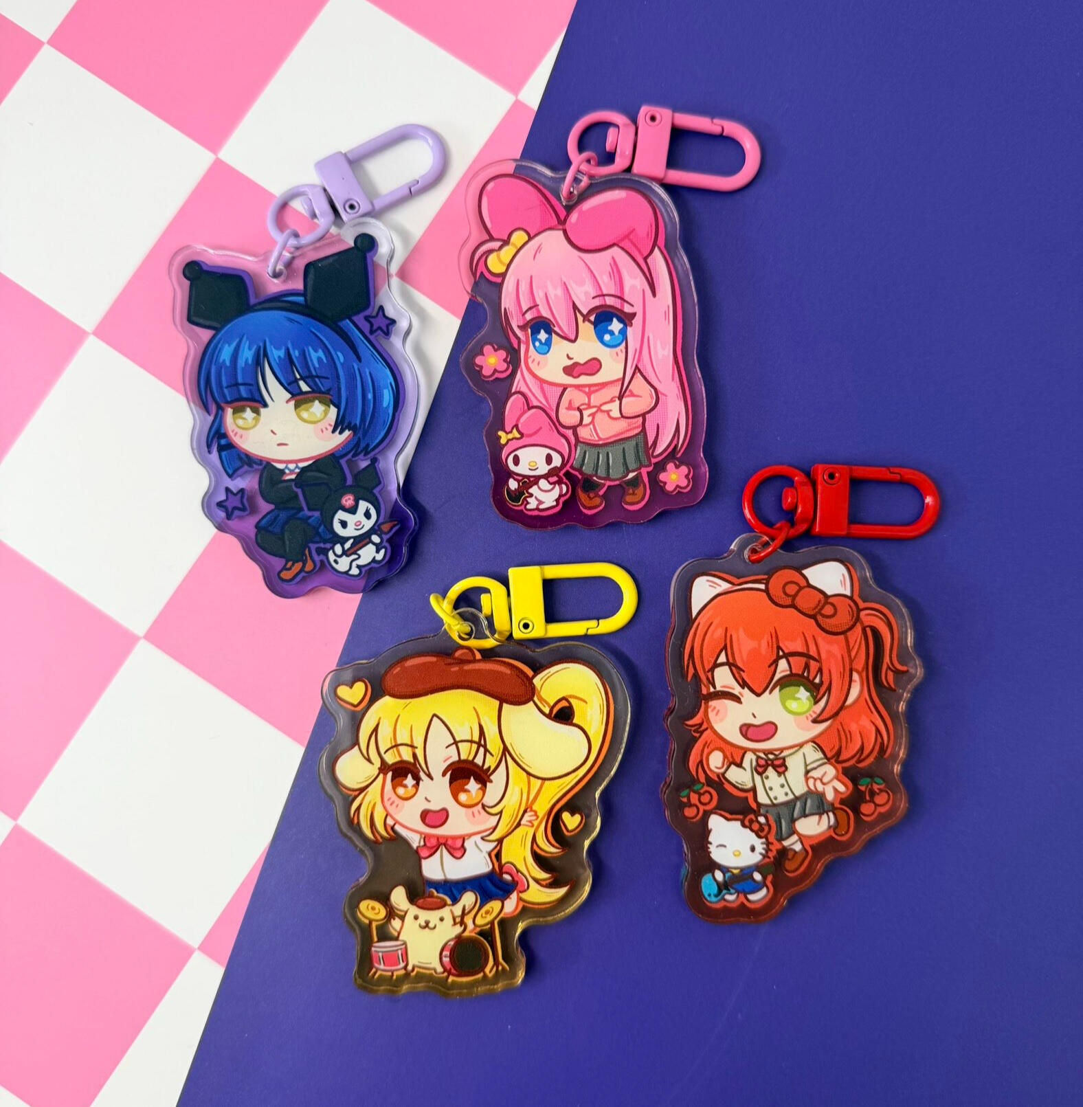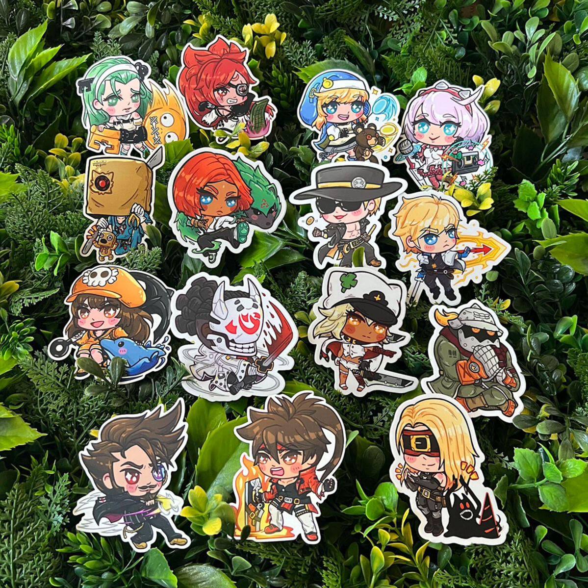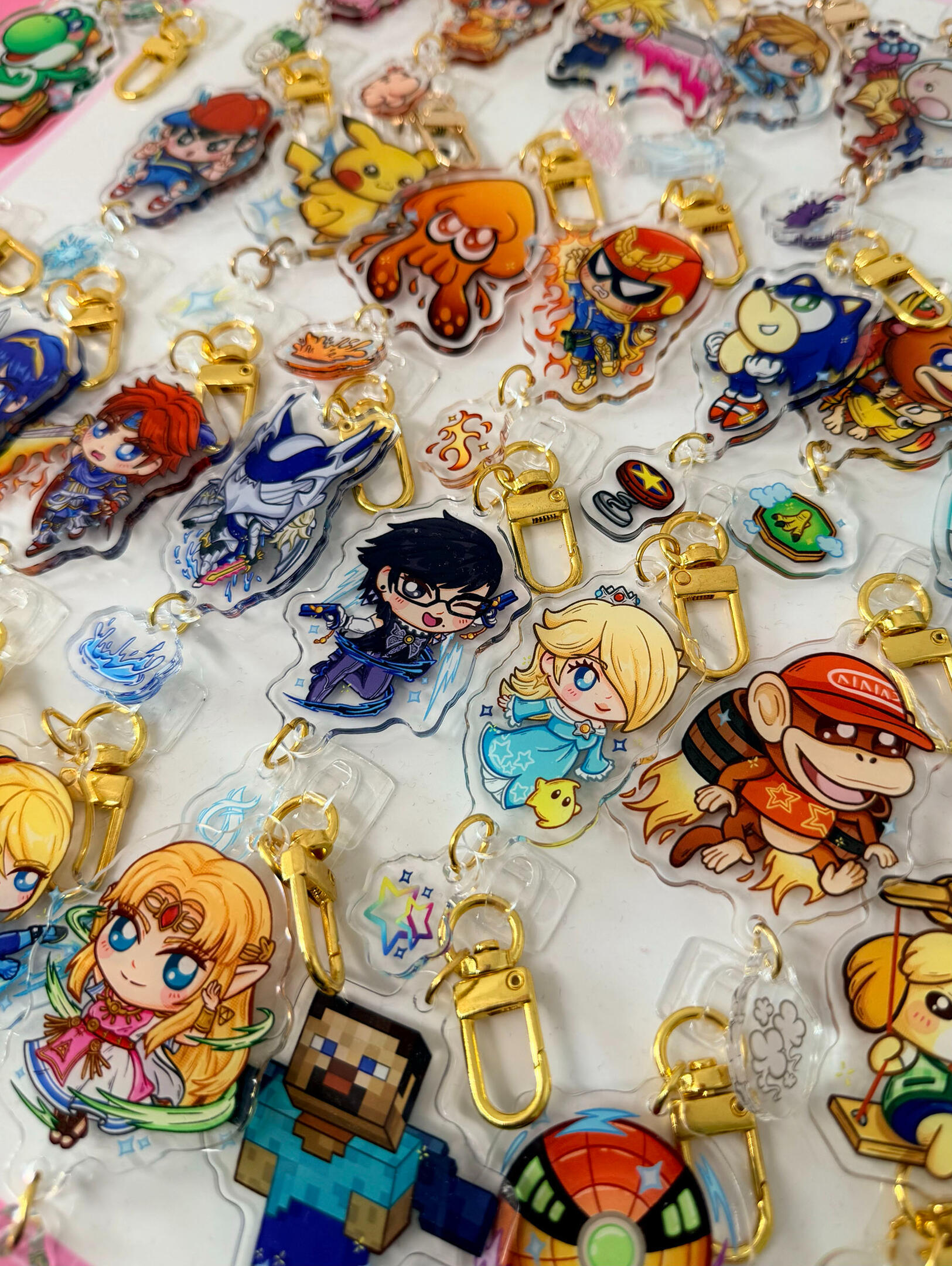 Prints, acrylic and wooden charms, acrylic standees, stickers, pillows, tote bags.