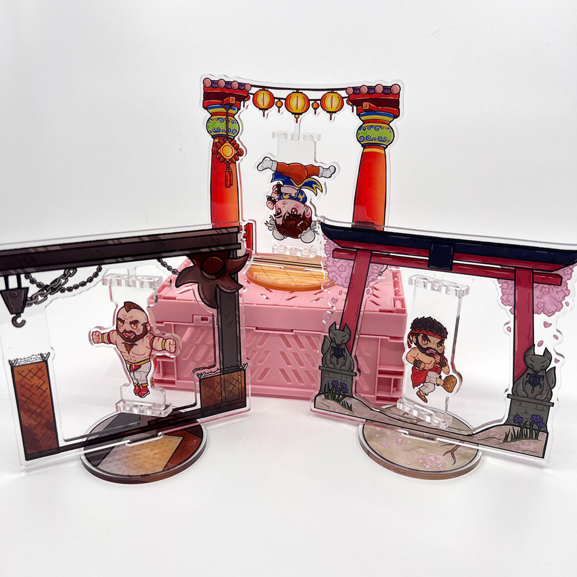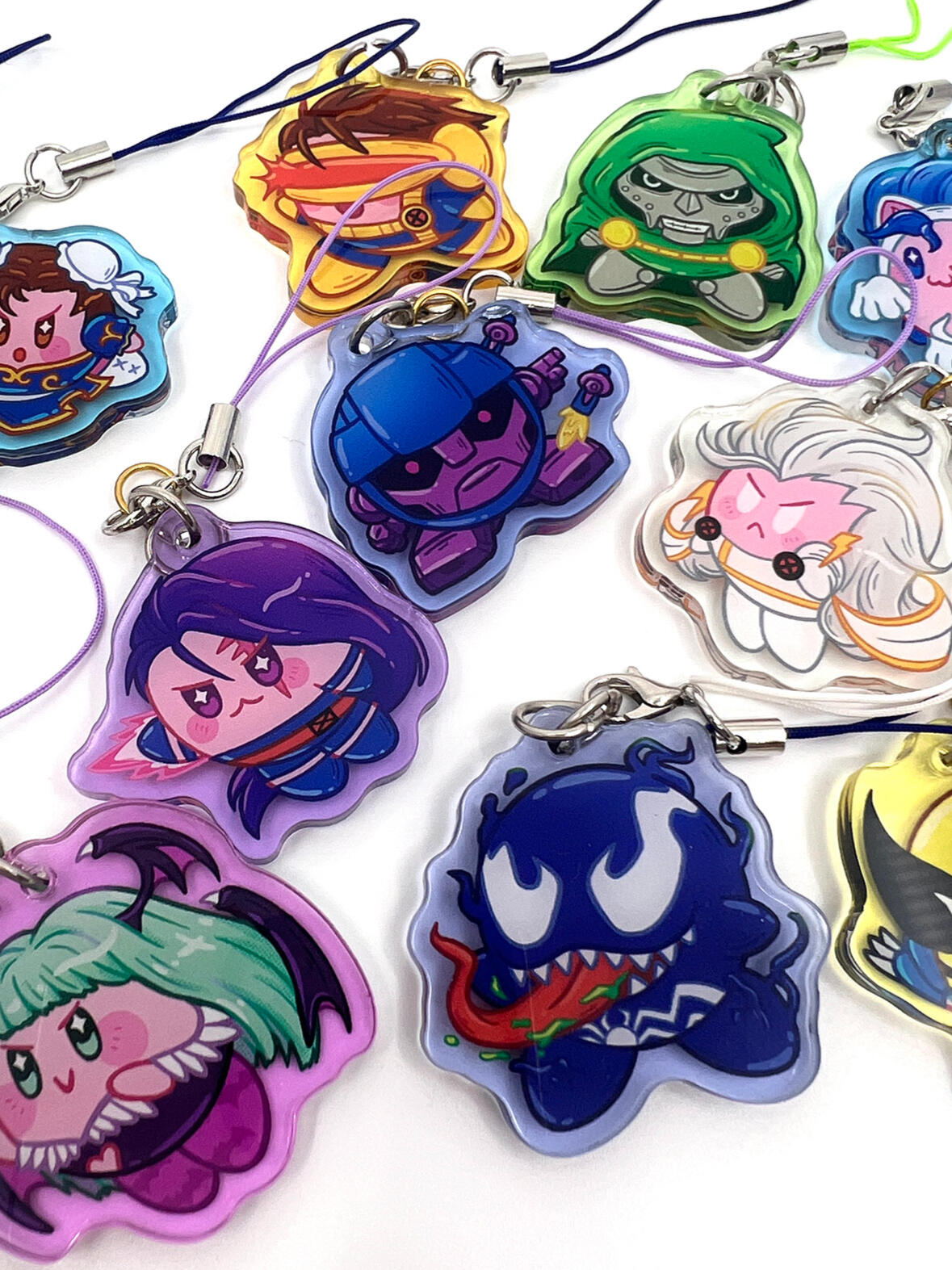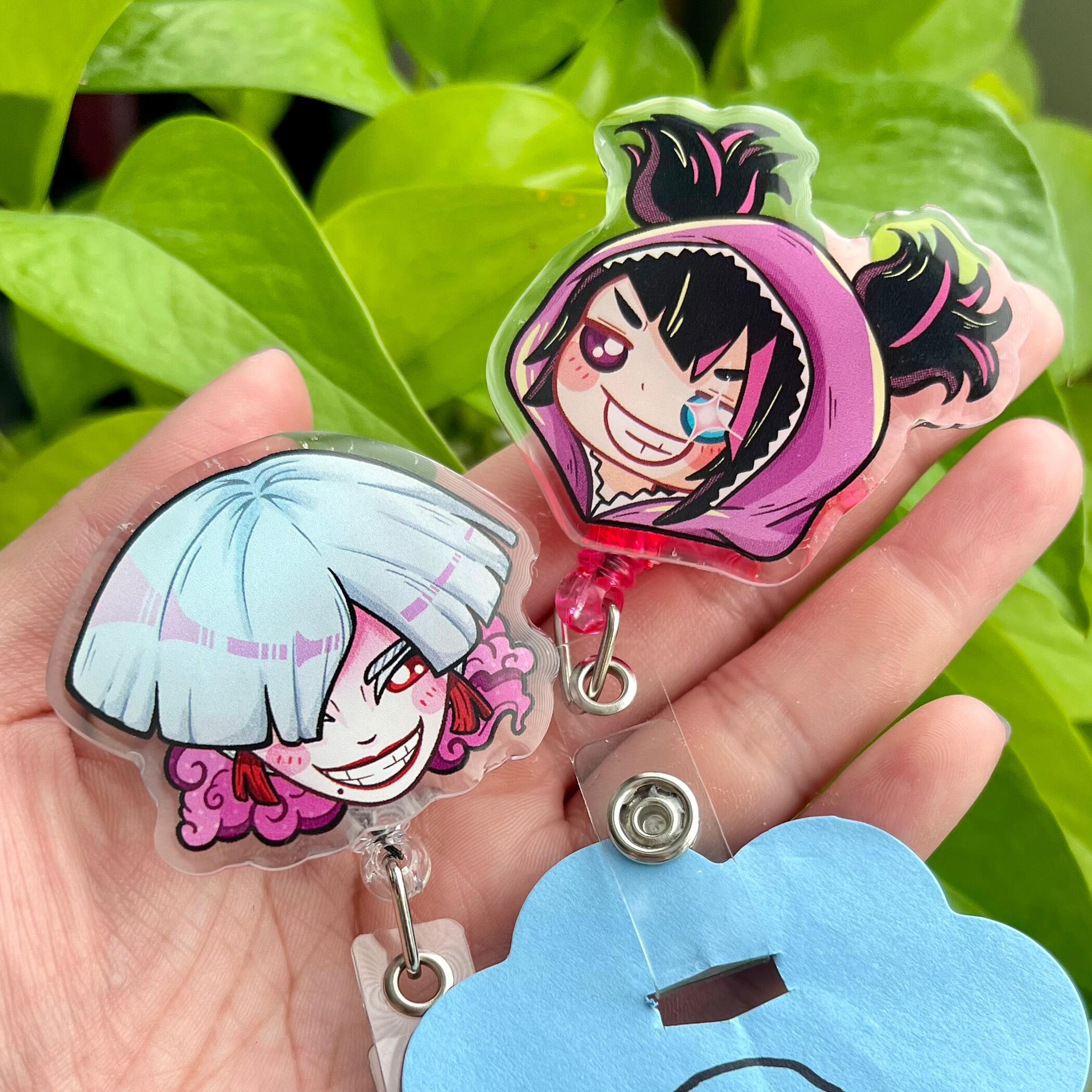 Prints, acrylic and wooden charms, acrylic standees, stickers, pillows, tote bags.
